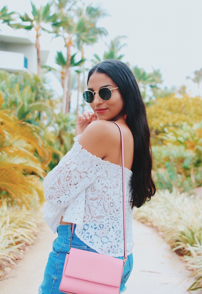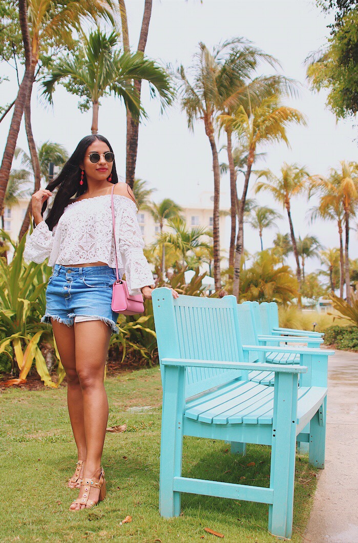 This look is the typical island look, sans heels. A boho flowy top paired with denim shorts is like the unofficial uniform in Aruba! It's very cozy and relaxed which is literally the definition of island way. This off-shoulder top is a favorite of mine and I've styled it tucked in (a skirt), with jeans, and now styling it with shorts.