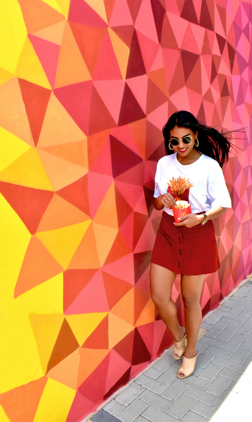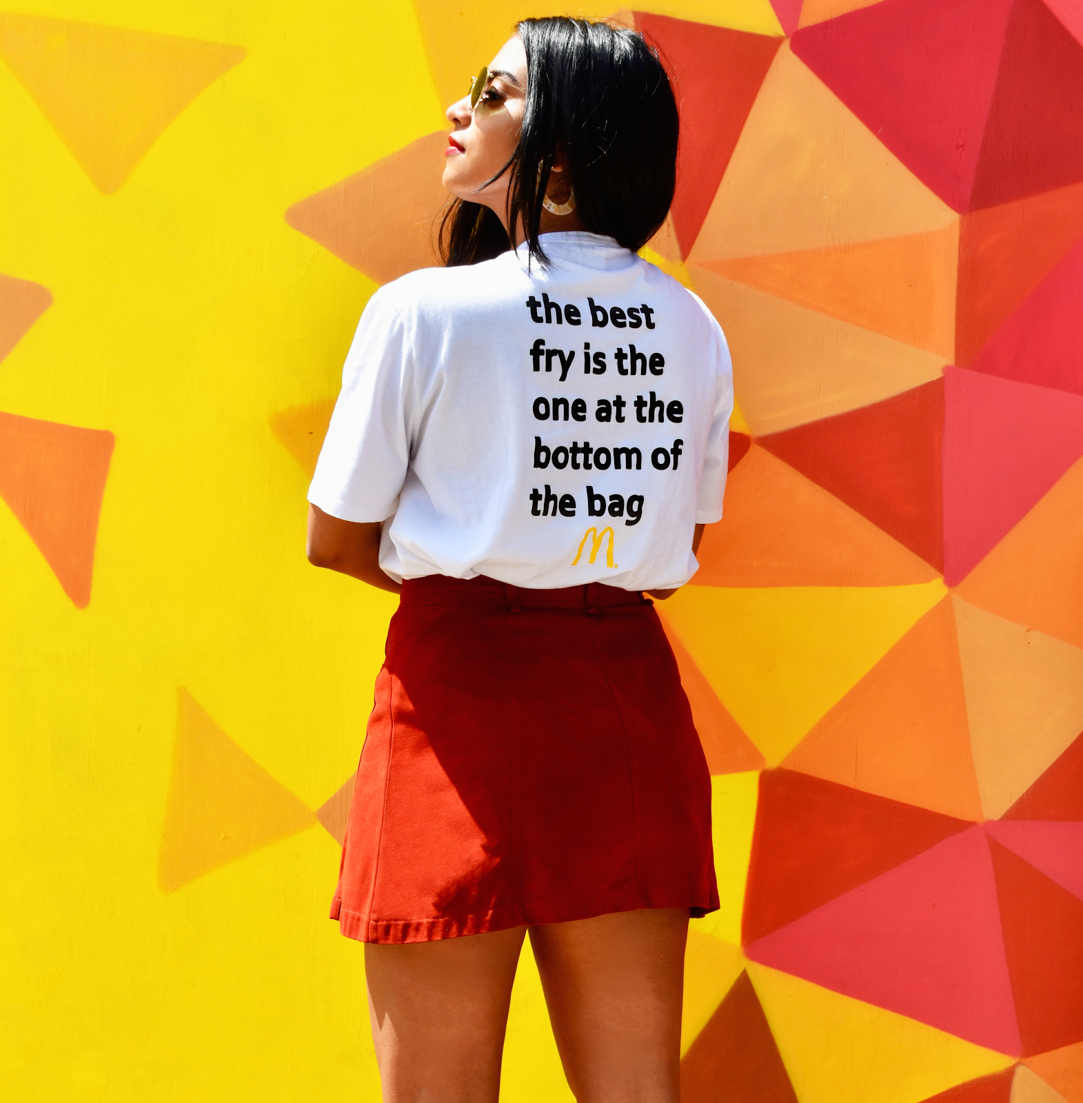 Today I am excited to share with you a super awesome collab I have been working on these past few weeks with McDonald's! Did you know that McDonald's recently paired with Zara and designed two items together? I am wearing the Tee which I styled here with a mini, mules and what outfit of mine is complete without my sunnies and a red lip to finish it off!